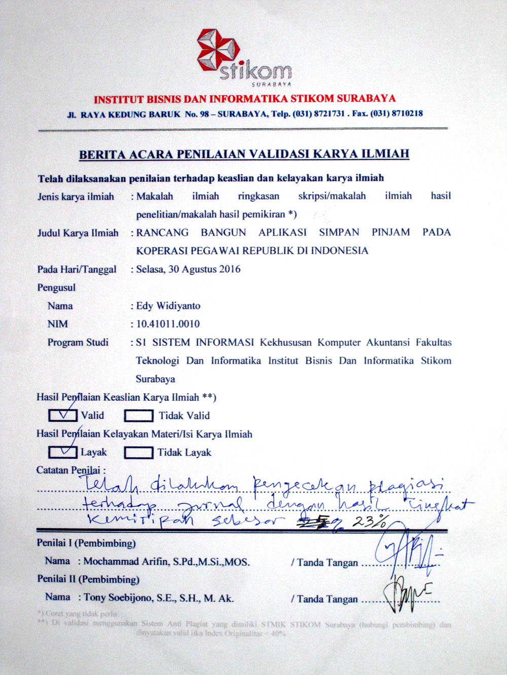 Abstrak: Koperasi Pegawai Republik Indonesia atau yang disingkat KP-RI “Hidup†merupakan sebuah instansi badan usaha koperasi yang bergerak dalam bidang simpanan, pinjaman dan usaha jasa. Di dalam usaha simpan pinjam, KP-RI Hidup bergerak menghimpun dana simpanan dari setiap anggota dan menyalurkan kembali untuk anggota dalam bentuk bantuan pinjaman dana dengan beban angsuran yang mudah dan ringan. Pegawai negeri yang menjadi anggota KP-RI dapat mengajukan permohonan pinjaman melalui bendahara gajinya. Permasalahan yang timbul yaitu pegawai negeri sebagai anggota KP-RI hanya mengetahui pemotongan gaji untuk angsuran pinjamannya yang tercantum dalam slip gaji. Dari permasalahan yang ada maka dibuatlah sebuah aplikasi untuk mengelola aktifitas transaksi pelayanan transaksi simpan pinjam di KP-RI. Aplikasi yang dibuat memiliki basis sistem desktop yang dapat dipergunakan oleh KP-RI untuk melaksanakan pelayanan yang lebih baik dalam transaksi simpan dan pinjam, lebih dari itu aplikasi didukung dengan sistem pemberitahuan atau notifikasi SMS-gateway yang dapat memberikan pesan pemberitahuan ke anggota mengenai sisa pinjaman dan aktifitas pembayaran yang sudah diberikan ke KP-RI Hidup. Sistem informasi aplikasi yang dibangun tersebut diharapkan mampu memberikan dukungan efektifitas kerja koperasi, terutama dalam pelayanan transaksi simpanan dan pinjaman maupun melakukan pencatatan transaksi yang lebih baik.Kata Kunci: Aplikasi, Simpan, Pinjam, Koperasi, SMS Gateway Abstract: Employees Cooperative Republic of Indonesia or abbreviated KP-RI "Life" is a cooperative agency business entity which is engaged in deposits, loans and business services. In the savings and loan business, KP-RI Life moves to collect deposits from each member and channeled back to members in the form of debt relief fund with a load of easy installments and light. Civil servants who are members of the KP-RI can apply for the loan through the treasurer salary. The problems that arise are public officials as members of the KP-RI only know a pay cut for installment loan listed in the salary slip. Of the existing problems then made an application for managing transaction activity in the savings and loan transaction services KP-RI. Applications are made to have a base desktop system that can be used by KP-RI to implement better service in the transaction savings and loans, more than that the application is supported by a notification system or notification SMS-gateway that can provide a notification message to the members of the remainder of the loan and activities that payment has been given to the KP-RI Life. The information system built applications are expected to support the effectiveness of cooperative work, especially in the service of deposit and loan transactions and keep records of transactions better.Keywords: Application, Deposits, Loans, Cooperative, SMS GatewayDownloads