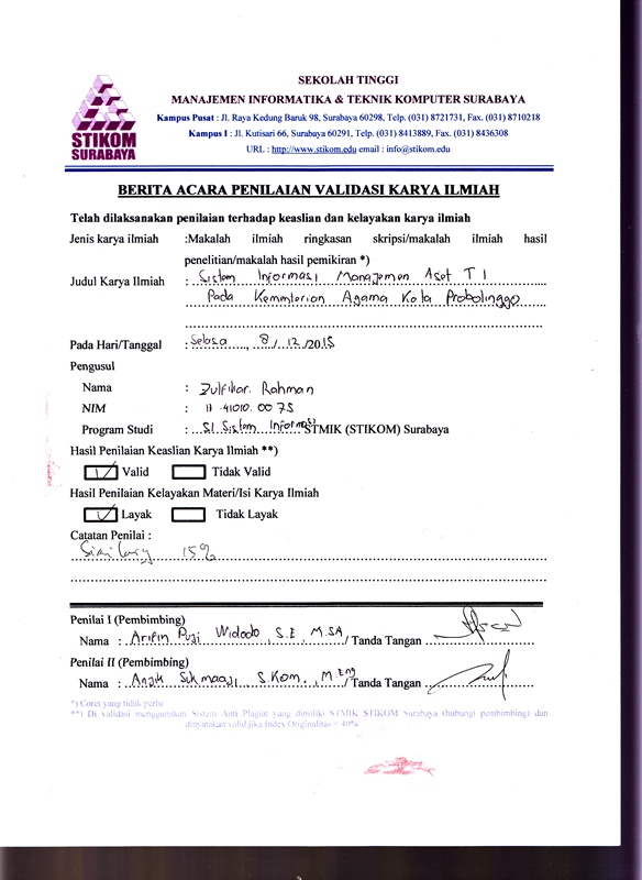 ABSTRACT: IT assets in Kota Probolinggo Religious Affairs is an operational support to any existing activities, so that the existing IT assets must be maintained condition and functionality. In the procurement planning process takes two months because he did not know the value of the economic life and in the process of planning the removal may also experience problems because the office does not use basic planning deletion based on the value of depreciation of assets, maintenance-related information and a list of damaged IT assets.