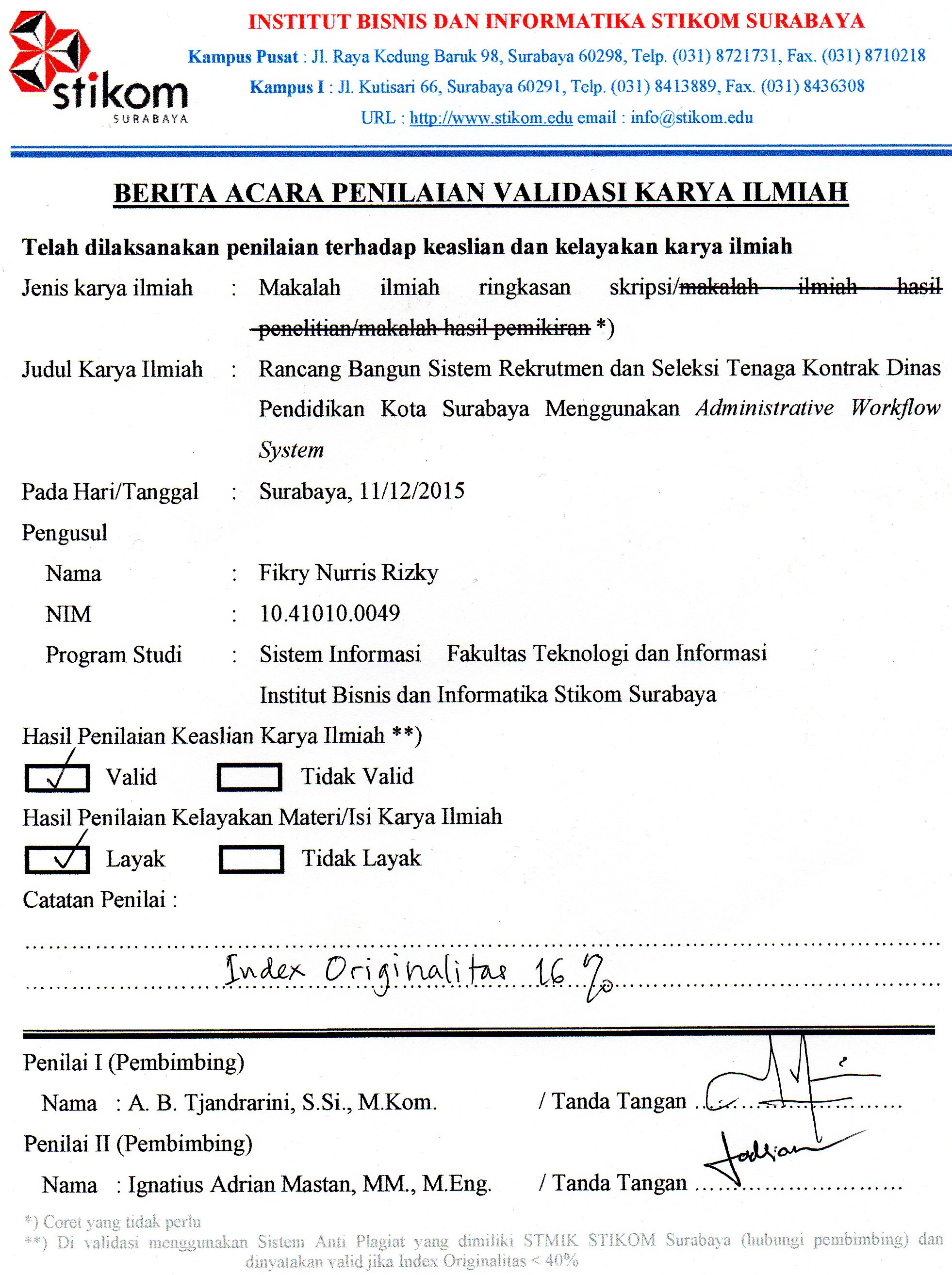 Abstract:Â Dinas Pendidikan (dispendik) Surabaya is an institution responsible for the academic in the city surabaya. In the recruitment and selection dispendik surabaya still use form paper and physical documents, sparking four problems found, namely: needs save document, the lost documents, delay selection process, the entry applicants and information about the assignment need a long time. Based on the problems on, found new risk, on how ensure recruitment process and selection keep going well although the paper was replaced to digital system. To complete the risk is found a theory, namely subsisting workflow system. To help Dispendik Surabaya in solving the existing, so the production recruitment system and selection staff on contract using sub sisting workflow system web based. The recruitment testing system and selection staff on contract it may help the Dispendik Ssurabaya reducing the paper documents to digital document of 71% of total at least documents for every applicants that should be kept. Based on the results of the questionnaire, this system shows 83.8% were among the interval 81% and 100% that category in a very good.