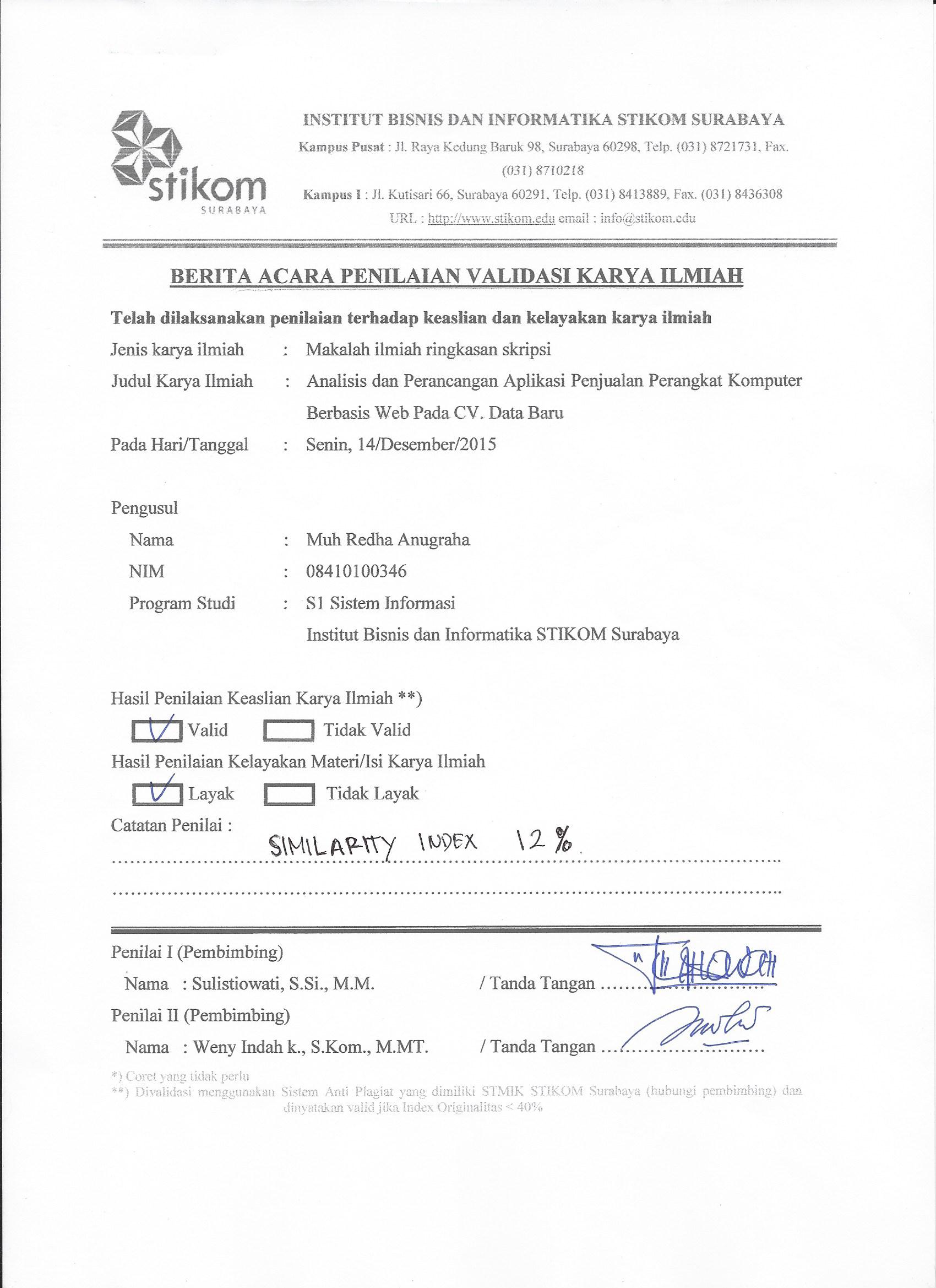 Abstract:Â The selling process of computers in CV. Data Baru currently ongoing manually. So far the sale of computers in CV. Data Baru can be done directly or indirectly. For the direct sale customers can come directly to the store, while for the sales are not directly usually customers ordered the stuff by telephone and email.