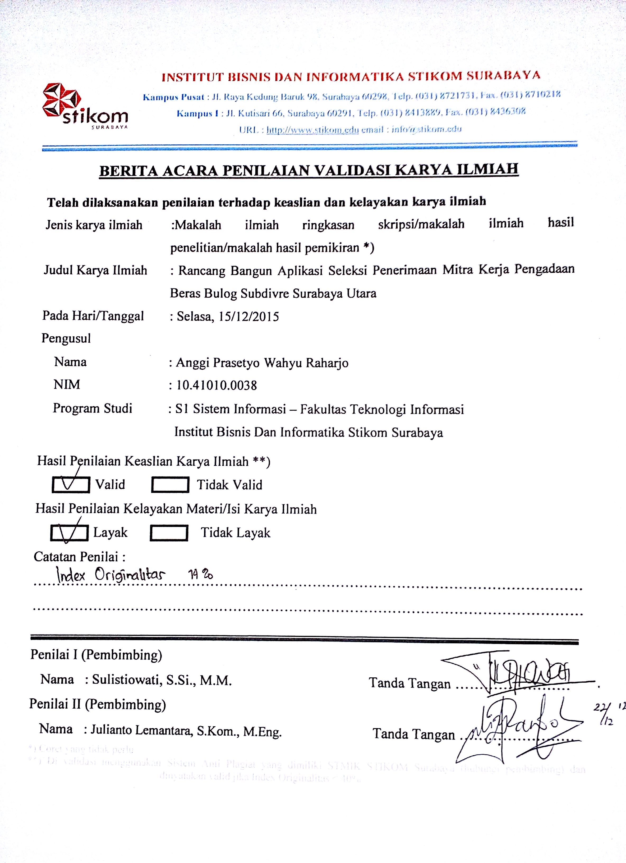 Rancang Bangun Aplikasi Seleksi Penerimaan Mitra Kerja Pengadaan Beras Bulog Subdivre Surabaya Utara
