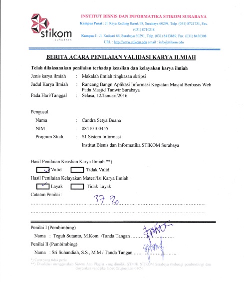 Abstract: Masjid Tanwir merupakan salah satu pusat ibadah umat islam di Surabaya, yang memiliki beberapa kegiatan rutin, yaitu meliputi sholat, pengajian dan Taman Pendidikan Al-Quran. Adapun kendala yang dihadapi oleh pengurus Masjid Tanwir saat ini adalah dalam proses pencatatan keuangan, pencatatan kehadiran jamaah dalam setiap kegiatan, dan pemberian informasi jadwal kegiatan kepada seluruh jamaah dan pengisi kegiatan masih dilakukan secara manual. Kendala yang dialami tersebut berdampak dalam pengelolaan kegiatan masjid yang kurang maksimal dan pengurus mengalami kesulitan dalam melakukan evaluasi. Aplikasi Informasi Kegiatan Masjid Berbasis Web sangat diperlukan pengurus masjid agar pengurus masjid dapat mengatasi kendala dalam mengelola kegiatan masjid tersebut sehingga dalam mengelola kegiatan Masjid Tanwir Surabaya akan lebih maksimal, karena pengelolaan kegiatan masjid harus dilakukan secara cepat dan tepat sebagai salah satu faktor keberhasilan manajemen masjid yang baik. Aplikasi informasi kegiatan masjid yang telah dibuat dapat memberikan informasi kegiatan secara tepat kepada jamaah dan pengisi kegiatan dengan menggunakan sms gateway, serta dapat menghasilkan laporan kehadiran peserta dalam setiap kegiatan dan laporan keuangan masjid sehingga dapat membantu pengurus Masjid Tanwir dalam mengevaluasi tingkat kehadiran dalam setiap kegiatan, dan laporan keuangan masjid secara berkala.