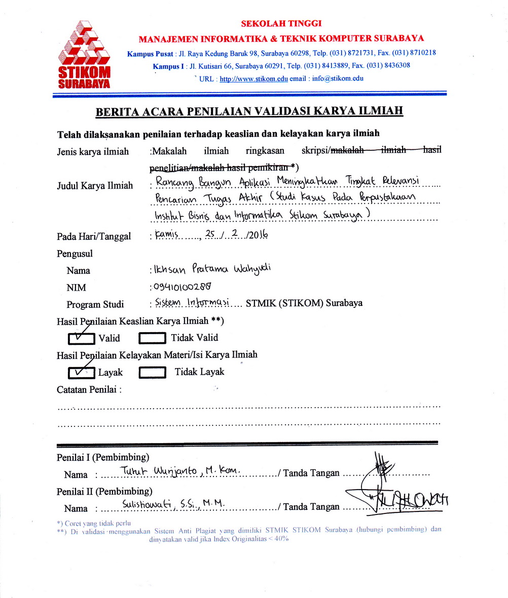 Design Aplications To Increase Relevance To Search Thesis (A Case Study In Institute of Business and Information Stikom Surabaya Library)
