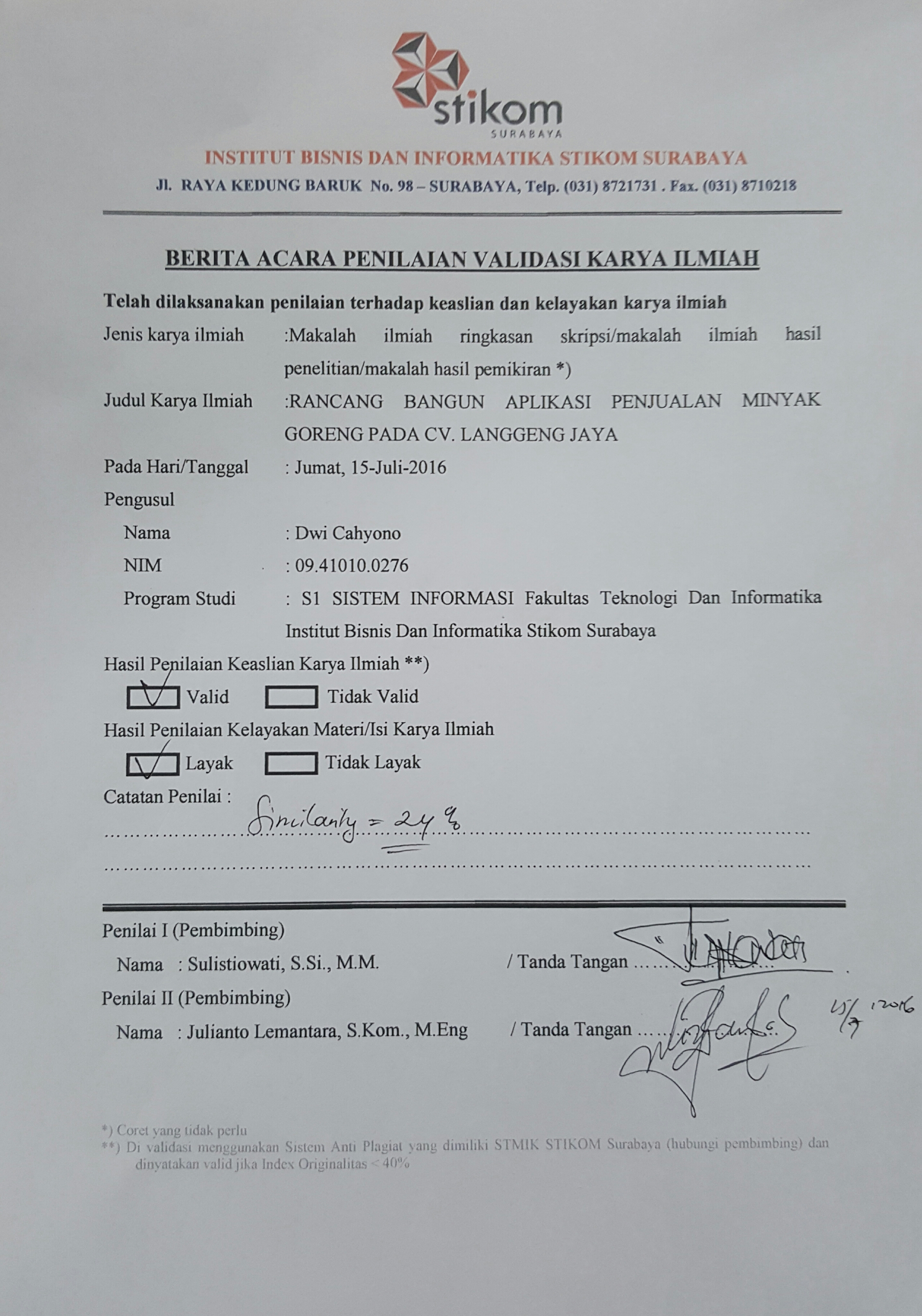 CV. LanggengJaya is a commercial enterprise engaged in the sale of bottled cooking oil with the brand "Iga Mas". The process of recording the price and the item code is manual. Such actions require recording process repeated thus inhibiting in the sales process receivable collection procedures. CV. Langgeng Jaya is a commercial enterprise engaged in the sale of bottled cooking oil with the brand "Iga Mas". The process of recording the price and the item code is manual. Such actions require recording process repeated thus inhibiting in the sales process receivable collection procedures. CV Langgeng Jaya also has disadvantages in terms of doing the collection of accounts receivable is due. Often there is a delay in collecting receivables to customers who have matured because of the difficulty in finding the data customer receivables. Based on these problems, it is built Design Edible Oil Sales Application at CV. Langgeng Jaya. This application consists of sales, accounts receivable reporting, sales reporting, calculating the cost of goods sold. The results showed that the Design Build Oil Sales Application at CV. Langgeng Jaya can be used to record, merekap sales data and generates nine major reports and the manager can use three invoices printed by part of the sales staff. There is a collection of accounts receivable reminder function that can be used by part of the sales staff to help deal with collection of accounts receivable. Lasting Jaya also has disadvantages in terms of doing the collection of accounts receivable is due. Often there is a delay in collecting receivables to customers who have matured because of the difficulty in finding the data customer receivables.Based on these problems, it is built Design Edible Oil Sales Application at CV. Langgeng Jaya. This application consists of sales, accounts receivable reporting, sales reporting, calculating the cost of goods sold. The results showed that the Design Build Oil Sales Application at CV. Langgeng Jaya can be used to record, merekap sales data and generates nine major reports and the manager can use three invoices printed by part of the sales staff. There is a collection of accounts receivable reminder function that can be used by part of the sales staff to help deal with collection of accounts receivable.