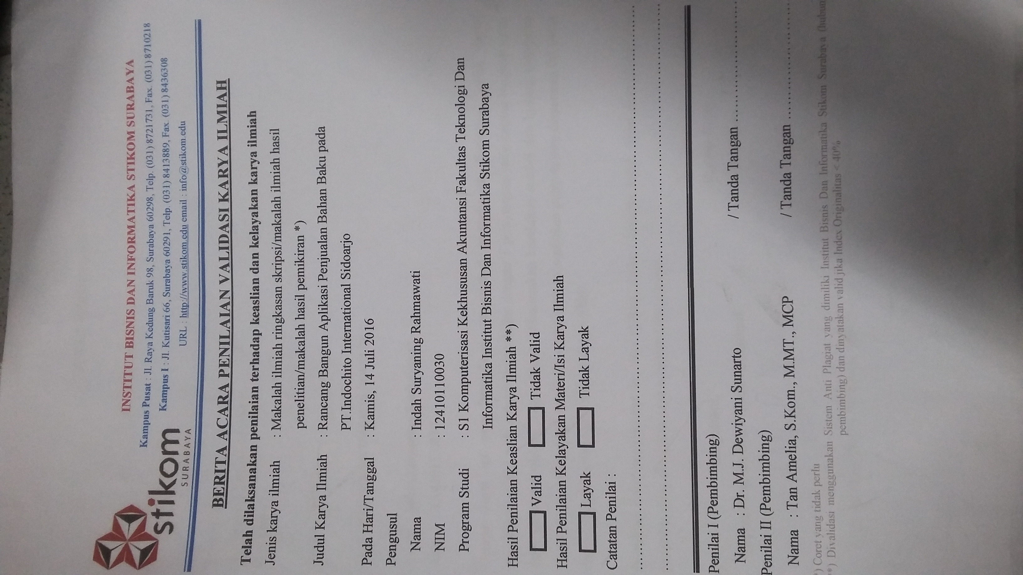 PT. Indochito International Sidoarjo built in 1999, located in Jalan Raya Wed-Betro Gedangan, Sidoarjo. PT. Indochito International is a company that specializes in import-export and general trading business. The sales process is a process that always takes place within the company. Based on observations and interview, the company experienced problems in the sales process and perekapan report is still considered in general and not detailed, and the frequent occurrence of errors in recording and perekapan report because it is still done manually and the length of time required to run multiple processes in sales. To overcome the problem, it needs to be made Application Raw Material Sales at PT. Indochito International. Stages of making this application begins with orders, sales, payment and reporting. Once tested, the application of sales of raw materials, can produce accurate data, order data, sales data, payment data, and data report.