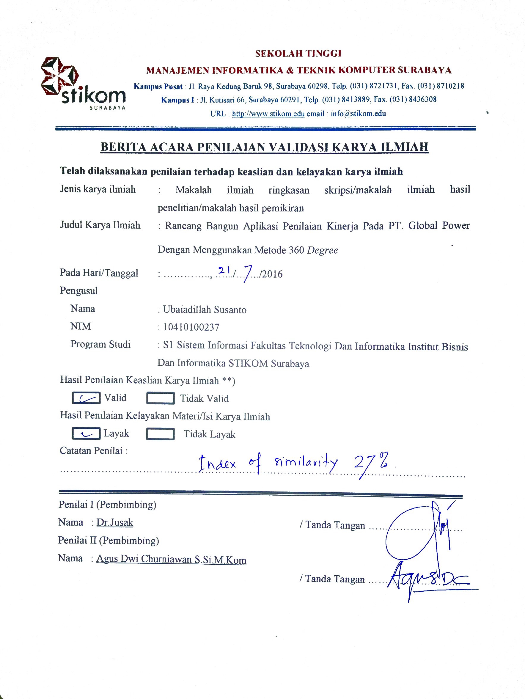 Rancang Bangun Aplikasi penilaian Kinerja Pada PT. Global Power Dengan Menggunakan Metode 360 Degree Authors Ubaidillah Susanto Jusak Jusak Agus Dwi Churniawan Abstract Abstrac Downloads PDF Additional Files turnitin copyright Published 2018-07-23 Issue Vol. 6 No. 3 (2017) Section Articles