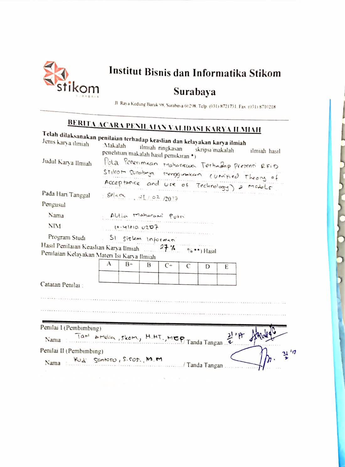 Persence of attending on RFID is one of the media to support learning processin business and informatics institution of Stikom of Surabaya. The application of presence of attending on rfid is expectes can ease college students to do the presence of attending in online before following the subject. However, the utilization of presensi RFID haven’t been tapped optimally by college students. The problem can be solved by doing an evaluation comprehensively and having adequate empirical studies which is suitable with the theory. The theory that is used to know the pattern of Stikom of Surabaya in final assignment, there is unified theory of acceptance and use of technology that is developed by Vanakatesh. UTAUT model has applied in academics by many research. This research found the opposite result of the theory of vankatesh. The four variabels (Performance expectancy, Effort Expectancy, Social Influence and Facilitating Condition) didn’t have positive influence of researcher also didn’t find the positive relation in facilitating condition variabel and habit on the use behavioral intention in using presensi rfid.