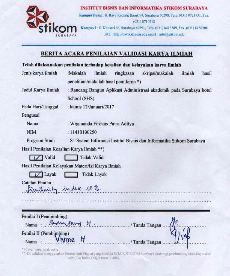 Administrative processes in an organization, especially the academic administration of an educational institution, is a core process in the course of the organization. In the process of academic administration, should be supported with adequate pengguanaan technology, so that the core academic processes are easier to run. Similarly, existing academic process at Surabaya Hotel School (SHS), until the current academic administrative processes are still standing separately in each, so the data is still not centralized and the academic difficulties in the process of administration and processing of existing data.
