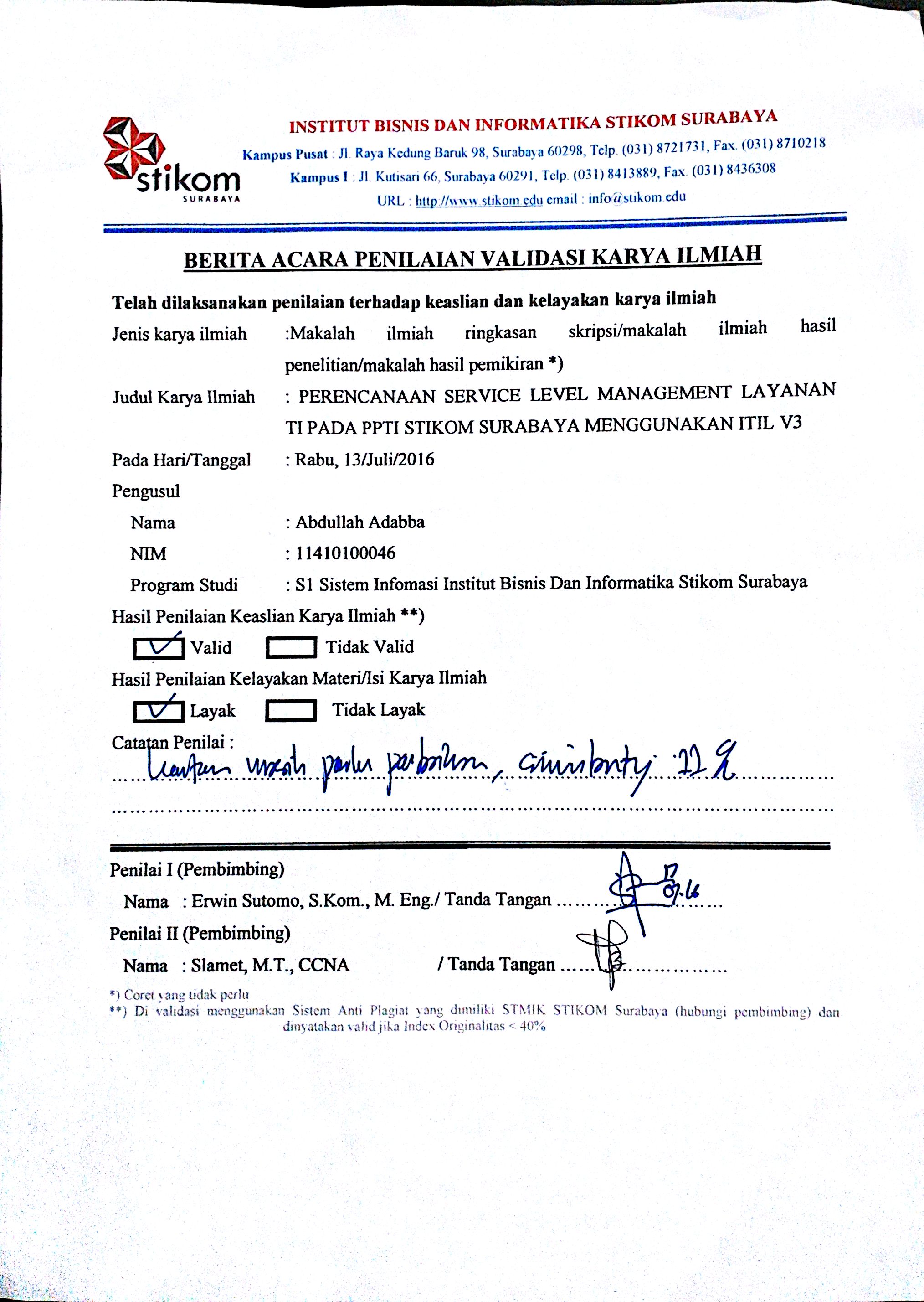 Perencanaan Service Level Management Layanan TI pada PPTI Stikom Surabaya menggunakan ITIL V3