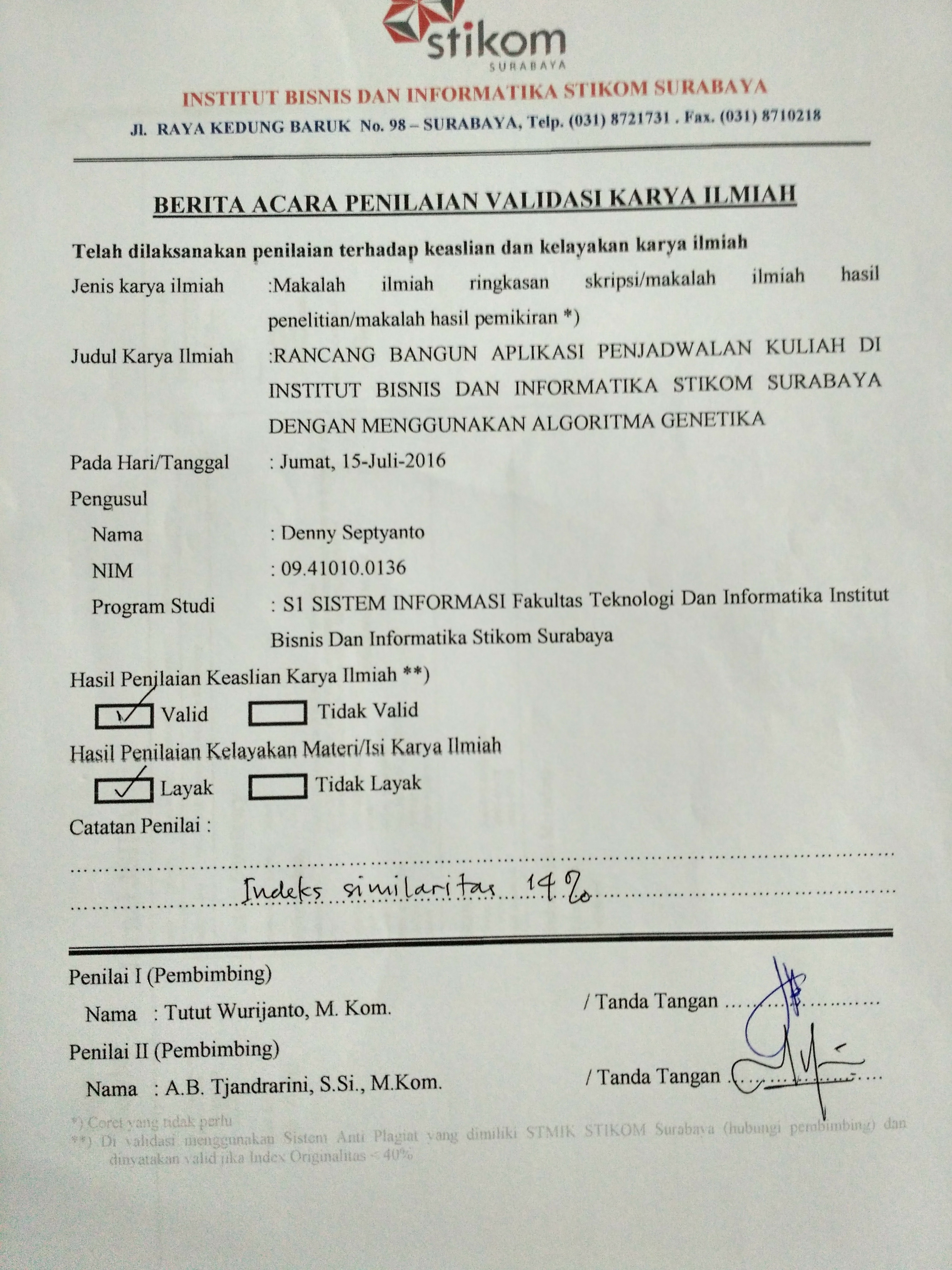 Rancang Bangun Aplikasi Penjadwalan Kuliah Di Institut Bisnis Dan Informatika Stikom Surabaya Dengan Menggunakan Algoritma Genetika
