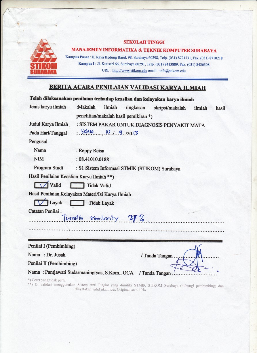 Eyes are included as one of important human sense which is very useful human vision. But people usually take care the health of the eyes carelessly and it is also because of the less information for people to keep the healthy eyes. Besides the minimum health facilities for eyes in the hospitals and the clinics and also less expert that make this symptom cannot be handled rapidly. To help people, in this case the expert can use method of system with process of inference forward chaining. This system was created in website basic for spreading the information to people so the health of eyes can be handled quickly. Based on the research, four consumers and an expert the result : i) Throughout seven times of research in validity system the symptom can be detected, ii) From the research of feature in system application the result are 3.4 from the consumer and 4.2 from the expert. From the result can be seen that this expert system application runs well, can be used and gives information of the symptoms and the solutions.Downloads