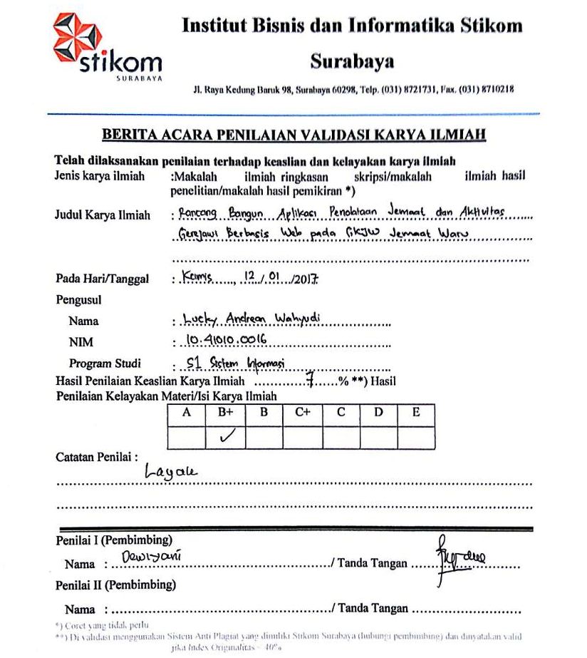 Problems faced by East Java Christian Church (GKJW) Church of Waru are no reports information about a church that is accurate enough to the head waitress Daily Assembly Church (PHMJ) as consideration for planning of ecclesial activity. To get the data to monitor active involvement in church and ecclesiastical activity, church congregations to collect data in each area periodically and perform every worship attendance. Unfortunately, data collection and recording attendance that do are often not documented and not well managed. As a result, completeness of data and information available so that the activity of the church less searches, as well as reporting changes related to church difficult. Based on these problems we need a web-based system has a database as a means to process, manage, and helps generate reports required by the head of the Church GKJW PHMJ Waru. The results of this thesis is the application of data collection churches and ecclesial activity (PJAG) can perform data management, so that the data generated congregation complete and search, as well as changes in reporting requires a short time. PJAG application can present a valid attendance calculations so that attendance recorded properly and the report generating valid information.