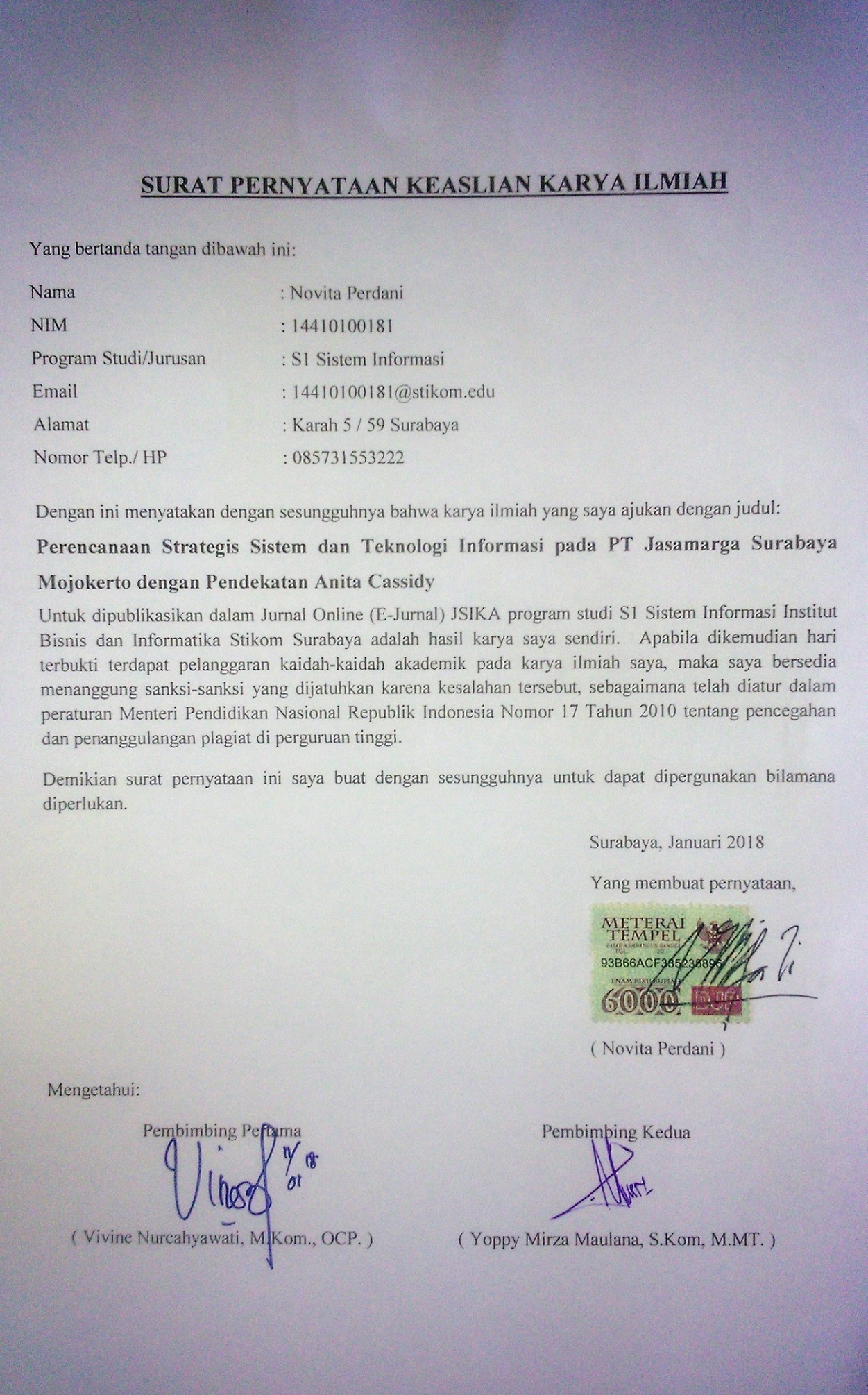 PT Jasamarga Surabaya-Mojokerto is a toll road entreprise with the main task to build, operate, and maintain Surabaya-Mojokerto toll roads. The Surabaya-Mojokerto toll road passes through 4 regencies (Sidoarjo, Gresik, Surabaya, and Mojokerto) and passes 37 villages with 306.20 hectare of land. PT Jasamarga Surabaya-Mojokerto experience some obstacles in the application of information technology systems. Investments in information technology systems that have been run not support the bussines goals oh the company. Another obstacle is the absence of clustering and priority scale of technology system development. To handle these obstacles, it is necessary to make strategic planning of information system with Anita Cassidy approach for PT Jasamarga Surabaya-Mojokerto. Strategic planning of information system can help companies to implement information technology system that align with business strategy and corporate goals, also can help clustering and determine the direction of development of information technology system.