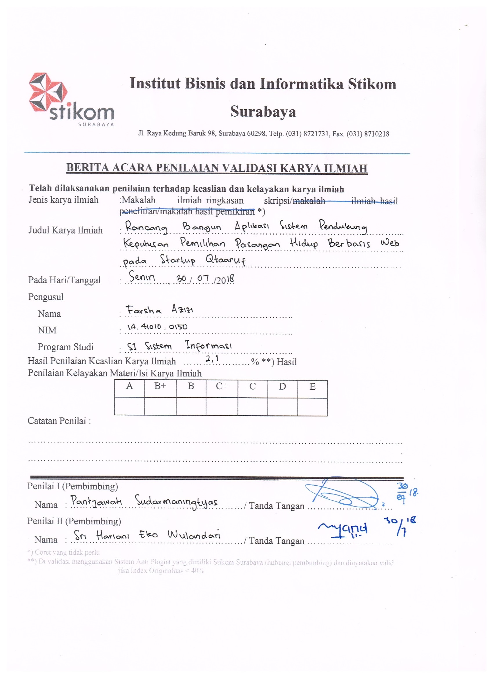 Qtaaruf is web-based online Islamic dating which as social movement. Matchmaking process which has been done by Qtaaruf and the Ustaz now are not using any specific criteria or any method to do a matchmaking process, therefore can take time around 1-2 weeks. The solution for the problem that has been described is to make web-based decision support system program for selecting spouse, using 5 criterias, age, height, weight, income, race (as a filter). Using fuzzy methode mamdani logic, the results is set combination from 4 criteria (except race), which then take the centre point for the fuzzy’s result. The test result is showing that the decision support system program for selecting spouse generate 3 recommendations of potential partner based on criteria which were chosen by user for selecting potential partner. this web-based decision support system program has been tested by using Excel and matlab. The 83.3% of the result showing not so much different from manually calculated by Excel and Matlab, resulting on the same category. The application's function has been tested using blackbox testing and the result is the application has run 100% as it should be.Downloads