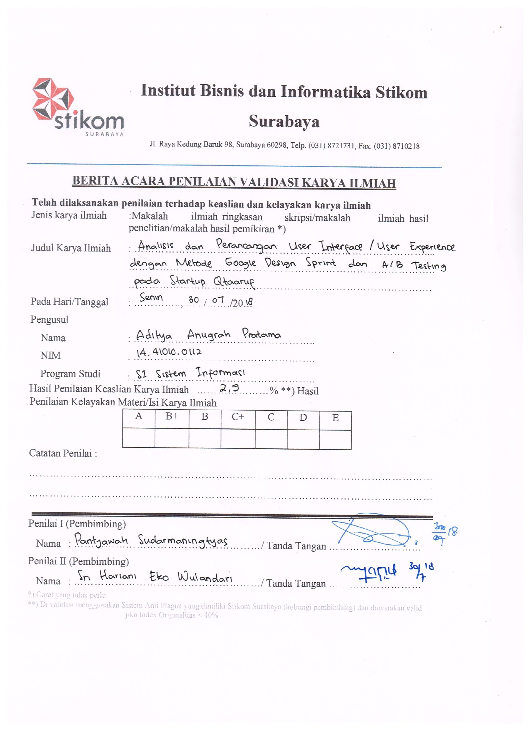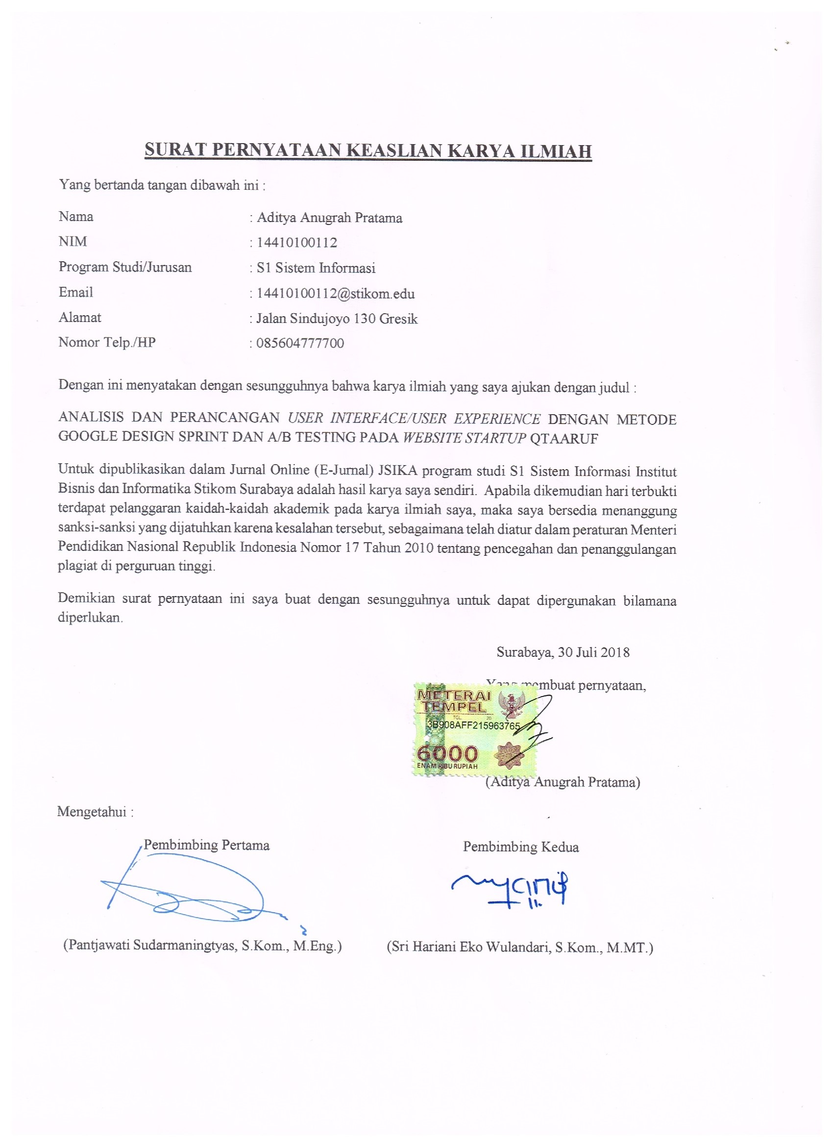 Qtaaruf is a startup from Surabaya that using a website as the media for interaction between users. The website now has around 10-20 visitors every day, it is classified as low visit for a website, because the inaccuracy of the user interface/user experience. This research is purposed to deliver a user interface and friendly user experience for the users in order to get information from the website, by using google design sprint that consist of 5 stages that are understand, diverge, decide, prototype, and validate. Validating process using a/b testing with 100 single moslem respondents in Surabaya at age range around 20-29. Based on the analysis, implementation and evaluation, resulting a final prototype, combination of A and B prototype which was validated form interface, use duration, and consideration of critique and feedback. Prototype A has been chosen for 4 features namely sign-up with 68,75% of the result, gallery, testimony, and taaruf process with 100%. Prototype B for the features of subscribtion with 100% of result. Prototype final delivers the user interface with colours harmony, consistency of layout, including notification for every interaction and user experience that match with respondent’s mindset for getting the information or reaching the objective.