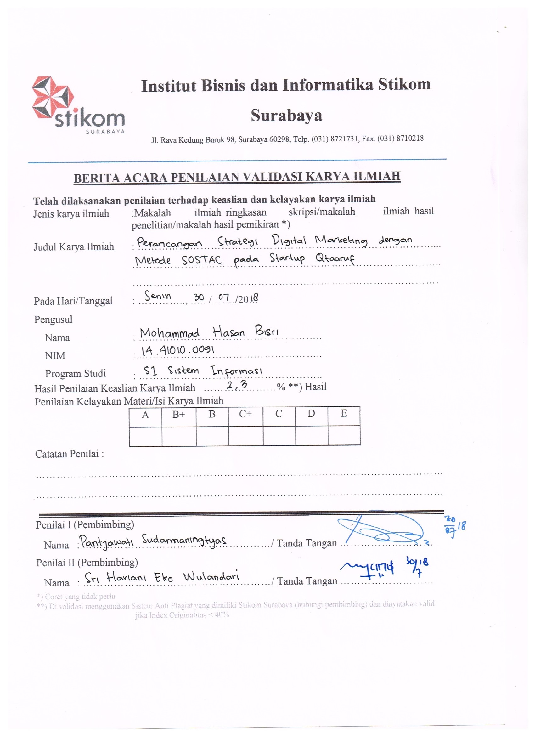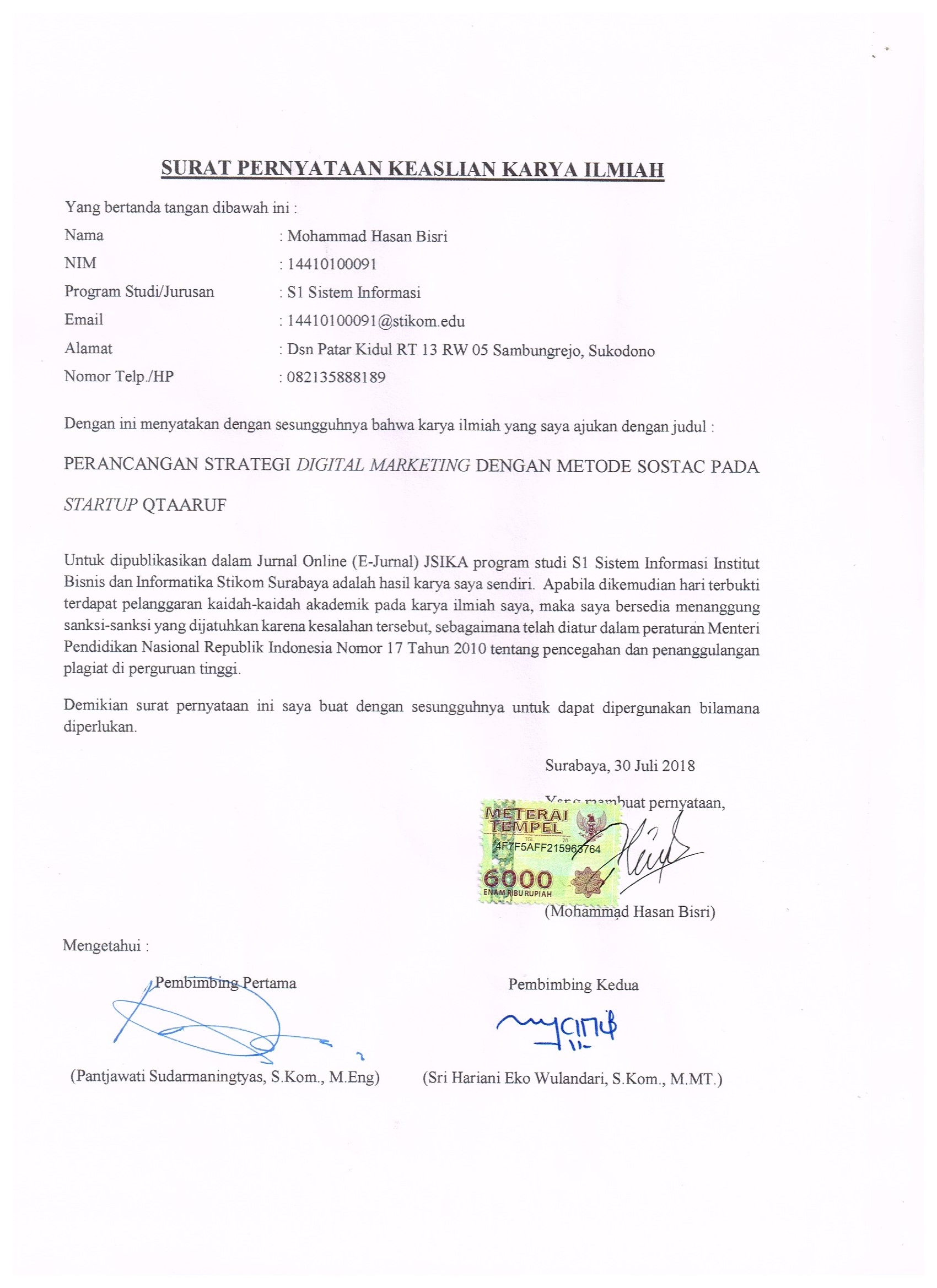 Startup Qtaaruf is online taaruf from surabaya. The user active processed on 17-23 october 2017 rise and fall and no access through social media. Based on 5 stages of an integrated digital life cycle marketing startup qtaaruf should be at point “gain position†on search engine , but they at point “gain followers†and “initiate relationships†that focuses increase user .This study attempts to documents produced digital design marketing by using methods SOSTAC consisting of the situation analysis, objectives, strategy, tactics, and action. Model SOSTAC to the training analysis, mapping training strategy strategy to 5s objective, mapping 5s objective strategy to the program, mapping tack to 4p and preparing for further step.The digital design marketing that produces 7 strategy as long as 12 months. Cost divided into 2 model. The first model and that is the ability organic for free, their profits audience will increase only berelasi on followers and following qtaaruf. The second model that is using campaign features cost Rp.7.400.000, their profits the wider audience. Potential reach 2.900.000 people with an estimated daily range 1100-100 audience every week and could lead to the website qtaaruf directly.Downloads