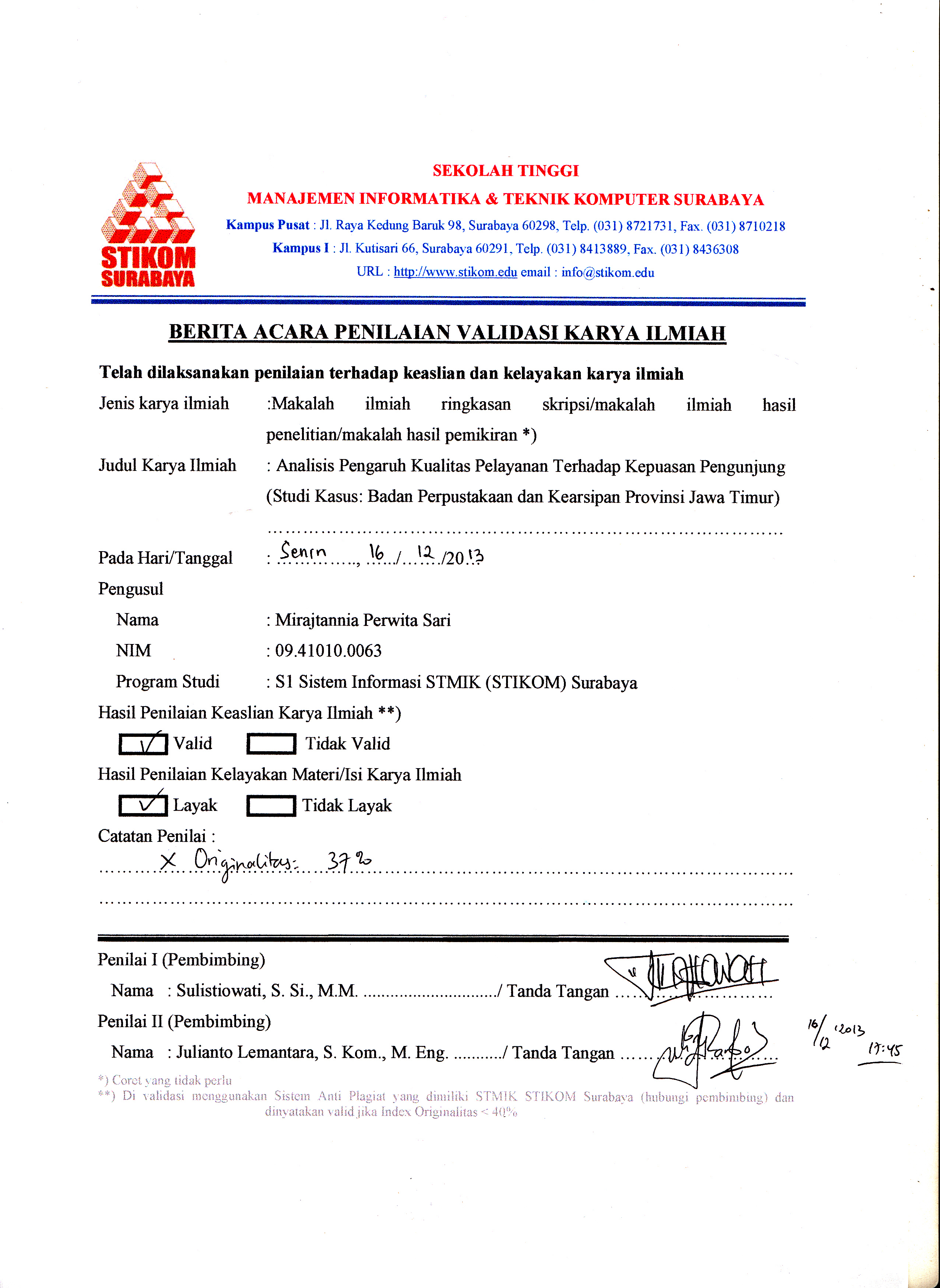 Analysis of the influence of the quality of the service of library visitors Satisfaction is much needed in the analysis of improvements to existing questionnaires in Badan Perpustakan dan Kearsipan Provinsi Jawa Timur.Problems in Badan Perpustakan dan Kearsipan Provinsi Jawa Timur is a questionnaire distributed by the Badan Perpustakan dan Kearsipan Provinsi Jawa Timur is still less effective because of the questions that are listed in the questionnaire is still not able to reflect the quality of service in compliance with UU No. 40 Year 2007 regarding the library, so it is still said to be yet can yield measurements better service quality. In addition, the library felt difficulty in knowing what factors can affect the quality of service. Doing so will result in the parties having difficulty in performing the management improvement of the service quality of the library.The solution of the above problems is to improve the content of the questionnaire based on standards used by the library.The analysis provides information in the form of the result of the processing of the questionnaires in the form of information service quality dimensions/factors that impact customer satisfaction. Analysis of results of processing of the questionnaires is the target that will serve the purpose of achieving the level of quality of the existing information systems.