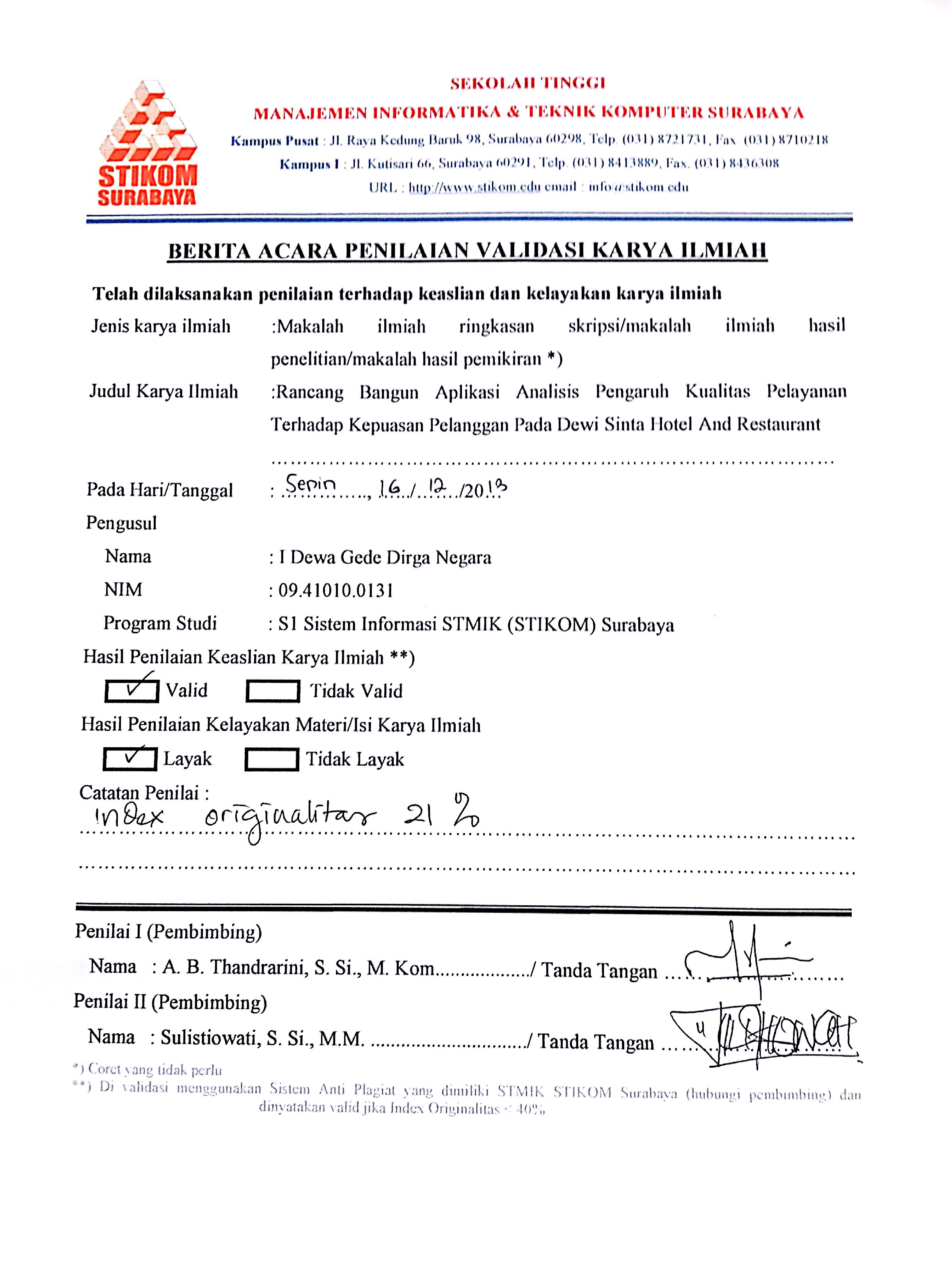 RANCANG BANGUN APLIKASI ANALISIS PENGARUH KUALITAS PELAYANAN TERHADAP KEPUASAN PELANGGAN PADA DEWI SINTA HOTEL AND RESTAURANT