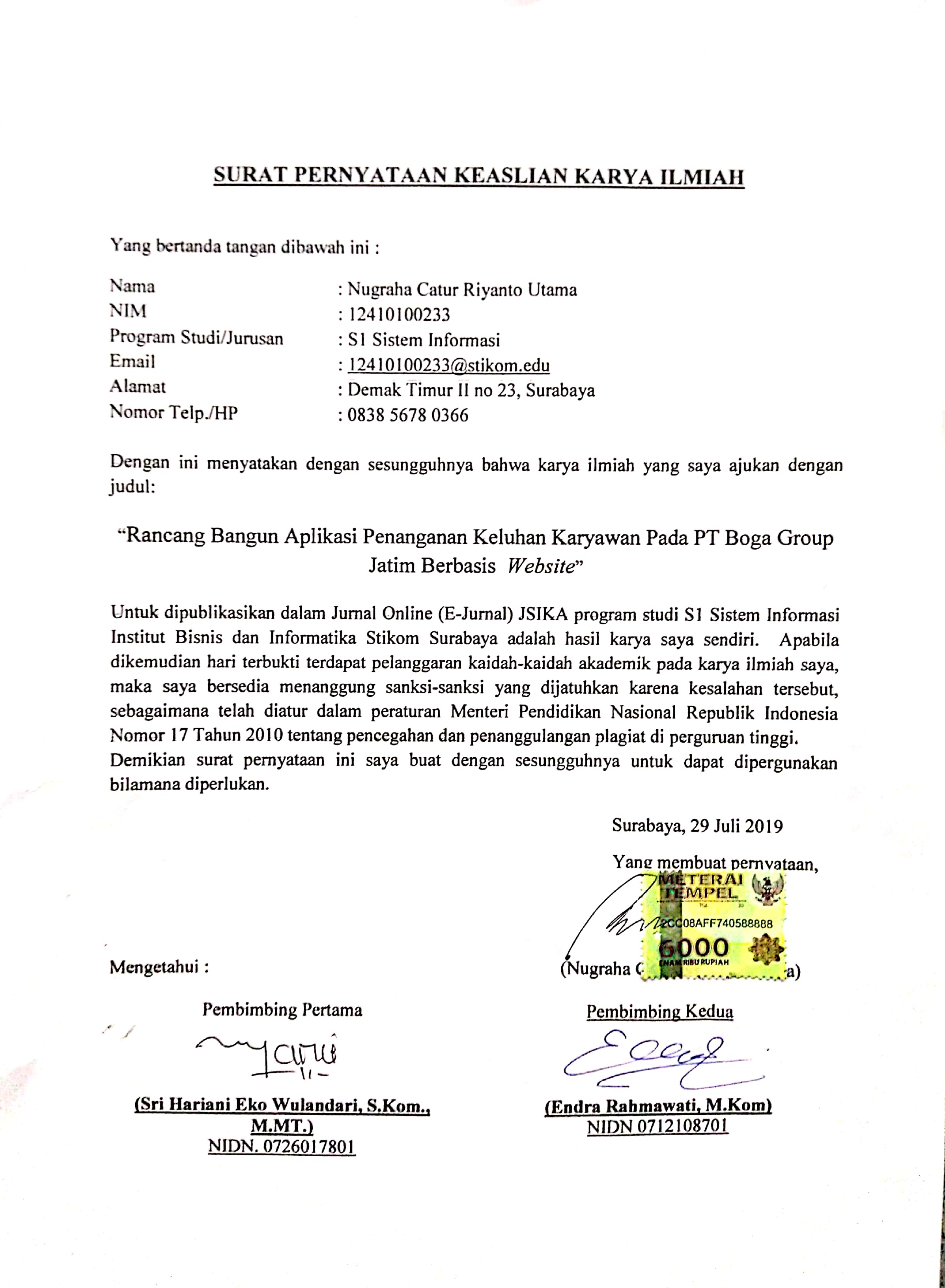 RANCANG BANGUN APLIKASI PENANGANAN KELUHAN KARYAWAN PADA PT BOGA GROUP JATIM