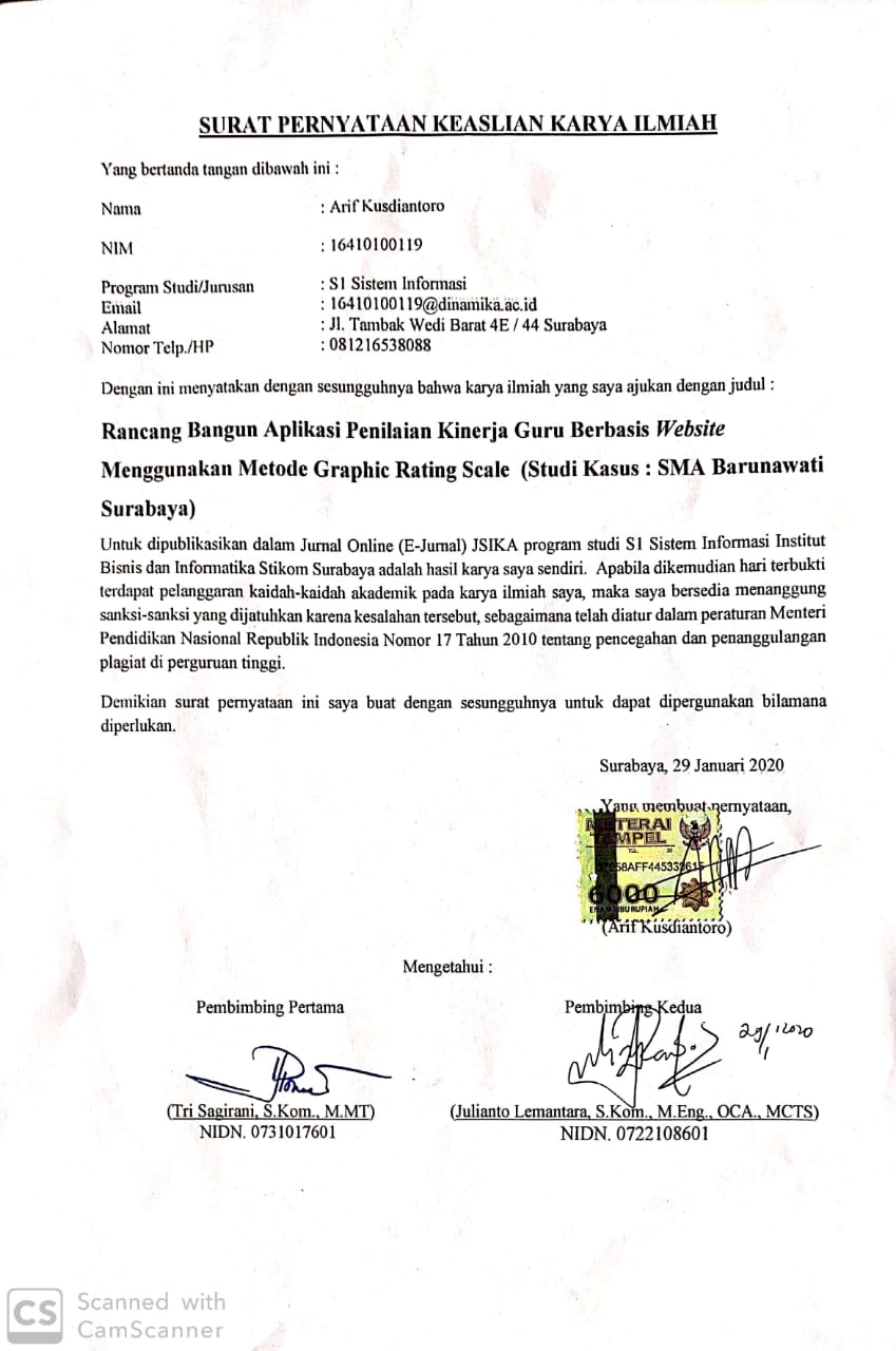 Rancang Bangun Aplikasi Penilaian Kinerja Guru Berbasis Website Menggunakan Metode Graphic Rating Scale ( Studi Kasus : SMA Barunawati Surabaya )