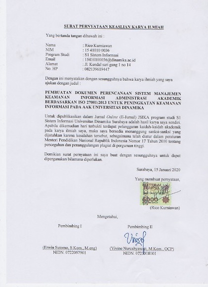 Dinamika University is an educational institution engaged in information technology. One of the misión of undika is to create profesional, superior and competent human resource. To support the mission, Undika has a supporting unit in the administration field, namely the Academic Administration Secction and the Student Affairs Section (AAK). The solution that has been carried out by the AAK section in handling information security is related to 3 (three) basic prociples of information security namely Confidentiality, Integrity and Availability is still limited to wholeness and confidentiality which can only be meet the management and technical sides, the support provided is to compile documents related to information security control and the creation of Standard Operational Procedure (SOP) documents which include policy documents, work instructions and work records. The results of this study are risk management documents and the preparation of objective controls and security controls used to support the preparation of SOP documents based on technical categories consisting of 5 policy documents, 5 SOP, 5 work instructions, and 11 work records. Management consist of 1 policy document, 1 SOP, 1 work instruction and 1 work record. Operational 1 policy document, 1 SOP, 1 work instruction, and 3 work recordsDownloads