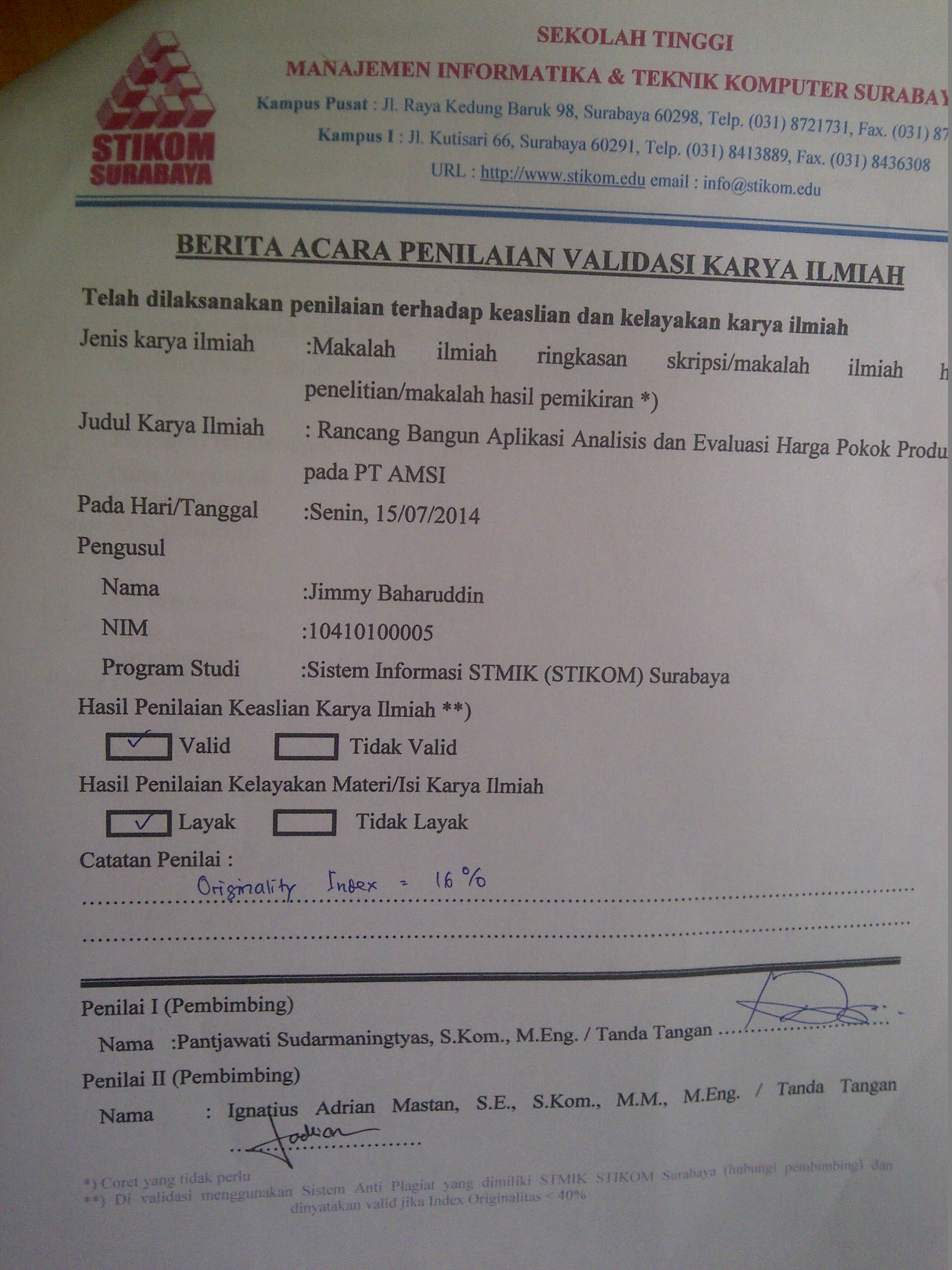 AMSI is engaged in the field of plastic recycling business located in Surabaya. AMSI serves more than one hundred shoppers scattered inside and outside the country. Still don't have AMSI mechanism in the process of evaluation, which is the production cost analysis calculations. Model of analysis appropriate for current analysis of three difference raw material cost, the analysis of difference for direct labor costs and analysis of four factory overhead costs for the difference. AMSI applications require can help conduct analysis and evaluation to control production costs. Application analysis and evaluation of the cost of production of the goods that can help make a difference in the cost analysis and providing reports to evaluate the production cost at AMSI.Downloads
