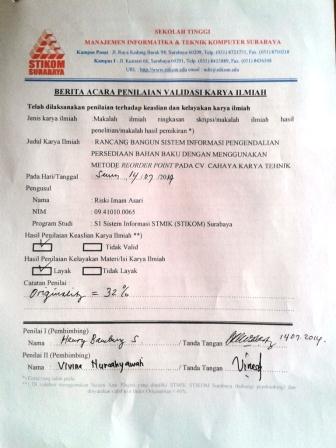Abstract: Warehouse in CV. Â Cahaya Karya Tehnik have problems in controlling the supply of raw materials because it is still done by manual. This results in the process of reporting for incoming raw material, Â raw material, inventory mutations the raw material, and reorder filing supplies raw materials takes time which tend to be longer. Â Â Because of that is required application control the supply of raw materials that can be used to take note of raw materials in, mutations raw materials, and the submission of reserving reexamined raw materials, so that the supply of raw materials at warehouse CV. Cahaya Karya Tehnik can run well and no vacant supplies. System also can print form mutation raw material that can be used as an archive warehouse. With the implementation of this system, the warehouse is no longer experiencing the emptiness of supplies of raw materials. The resulting system is expected to address the existing problems so far, and the resulting information will be more accurate. Besides that part of the barn is CV. Cahaya Karya Tehnik can control the supply of raw materials that is in the barn.