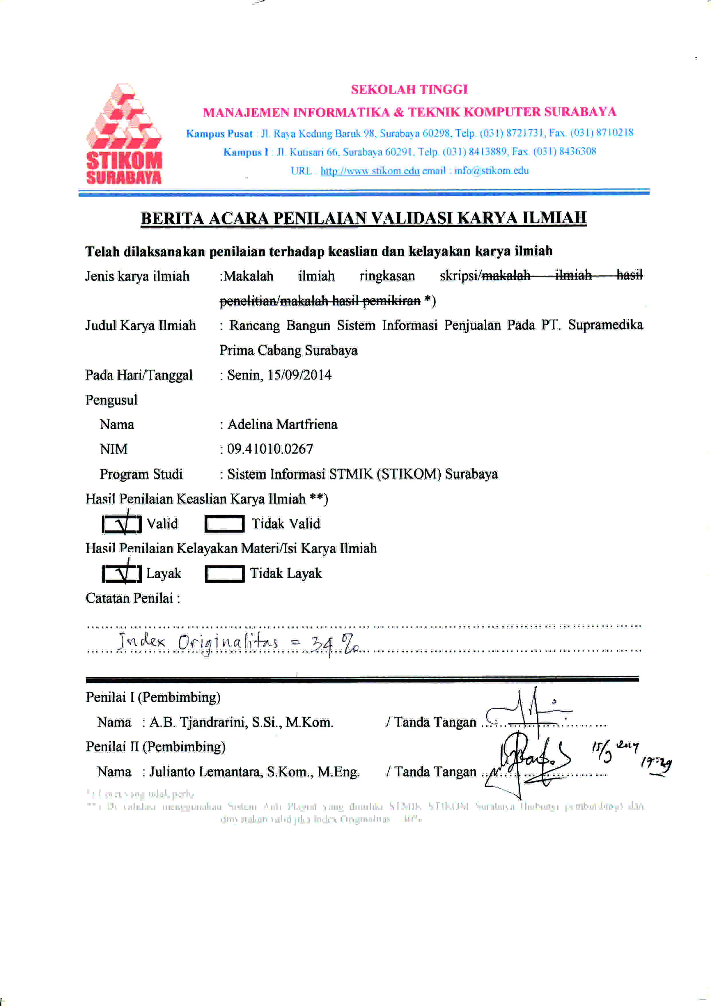 PT. Supramedika Prima Cabang Surabaya is the sole distributor of selling health equipment and drugs reagent in eastern indonesia based in jakarta. The sales activity on PT. Supramedika Prima currenty includes approval reservation, procedures of payment (for cash or credit), delivery order, to the procedure billing if payment made on credit. As an evaluation on company requires information of sales made each month. Incomplete information owned currently can obstruct activities evaluation selling by sales manager especially ifthe transaction data being tucked or not copied. The solution to take over those problems were made a sistem which can be used to save and manage sales data, and generate information which is needed as evaluation. That solution is an sales information system. Information system which has been made was adapted by company requirement. Sales data which has been saved and proceed by a system was used to generate company requirement report. The conclusion of test result, this sales information system can generate nine (9) reports which can be used by manager as an evaluation. This information system has a billing remainder system that can be showed when sales staf did login, this system can be used as a tools which can help bill collector staf to remain bill schedule for customer.