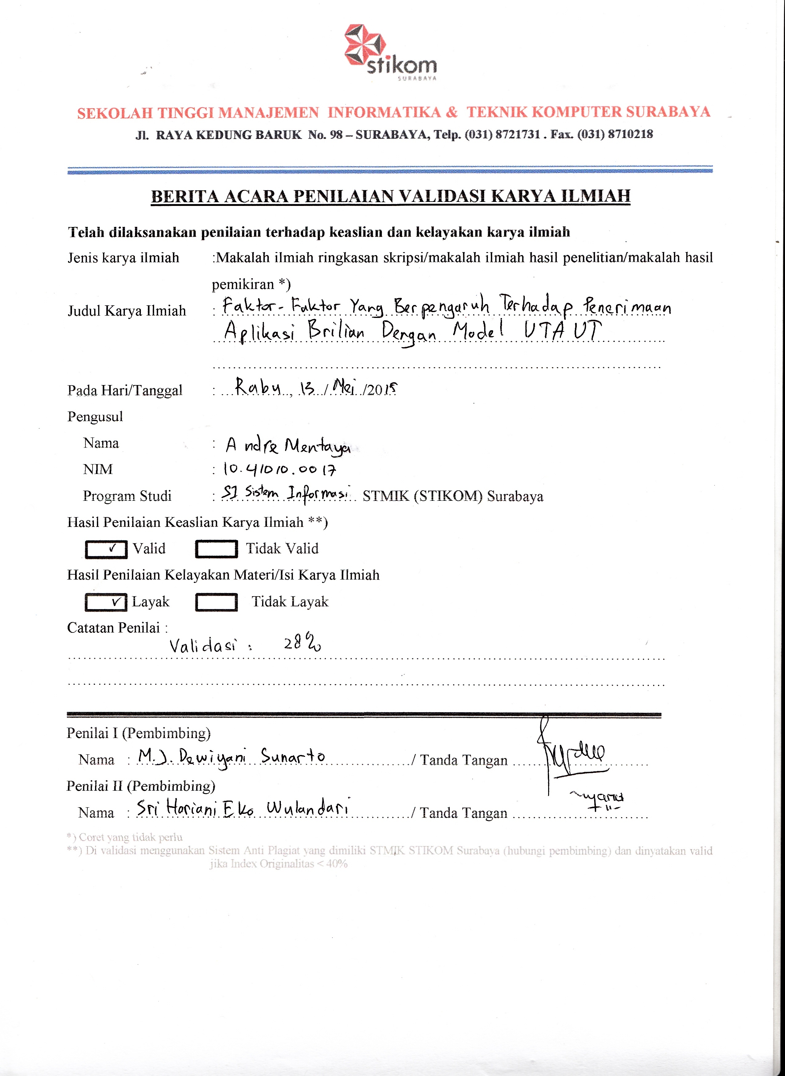 According to a decree number 290/KPT-03B/VII/2014 about implementation of Hybrid Learning Model clause six, lecturer Stikom required to implement Brillian as a learning medium. This is not the first time Stikom Surabaya implementing an e-learning application. From many kinds of e-learning that has been applied previously, none of application that can be accepted as a medium of teaching and learning, whereas already a lot of material and non-material sacrificed to implement a variety of e-learning. Try to overcome these problems by conducting a comprehensive evaluation and adequate empirical studies in accordance with theories. One theory could be used to evaluate the acceptance of information technology is the Unified Theory of Acceptance and Use of Technology (UTAUT) which was developed by Venkatesh in 2003. The result of this study case found the opposite result with Venkatesh theory. The four factors (Performance Expectancy, Effort Expectancy, Social Influence, and Facilitating Condition) does not influence significantly to increase Behavioral Intention or Use Behavior. Only Behavioral Intention proven to have significant influence on the Use Behavior. Besides moderating variables (age, gender, experience and volunteerism) was not found to have a significant influence in intent and actual use of Brilliant.Downloads